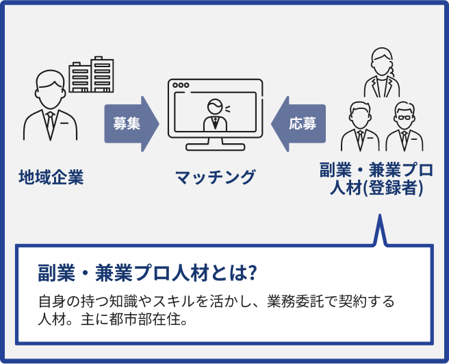 本事業では、地域貢献意欲が高い副業・兼業プロ人材と地域企業をマッチングし、東北地域の企業様の経営課題の解決を図るとともに、地域へ移住したり、地域の企業へと転職しなくても、副業という形で都市から地方へと「スキルをシフト」させることで地域課題の解決、活性化に繋げることを目指しています。