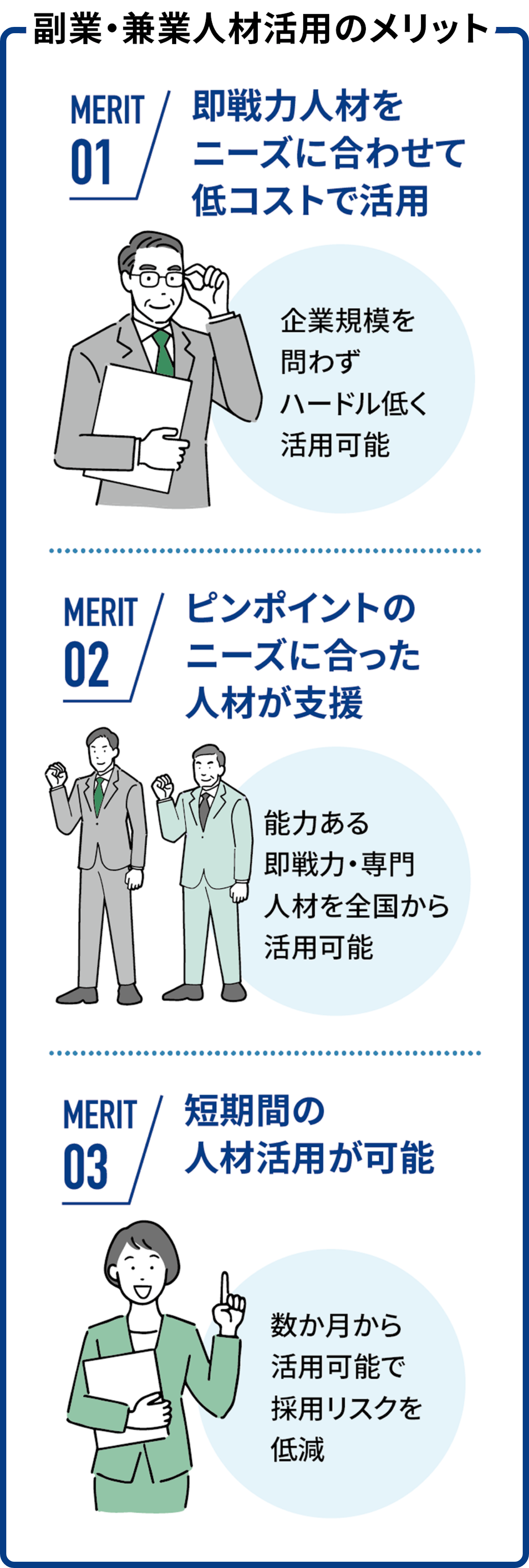 稼働後のサポートまで伴走し、不安事や負担を軽減。安心して副業・兼業人材を採用可能です。